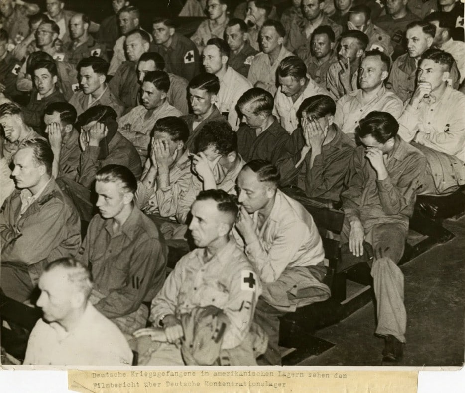 18 – 強制収容所の様子の映像を見て感情的になるドイツの囚人達。 [1945年]