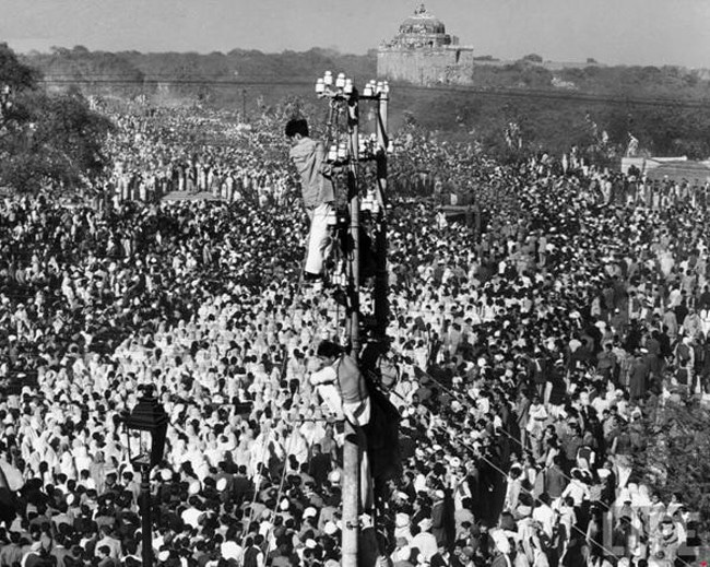37 – ガンジーの葬列を眺めようと電柱によじ登る人々。 [1948年]