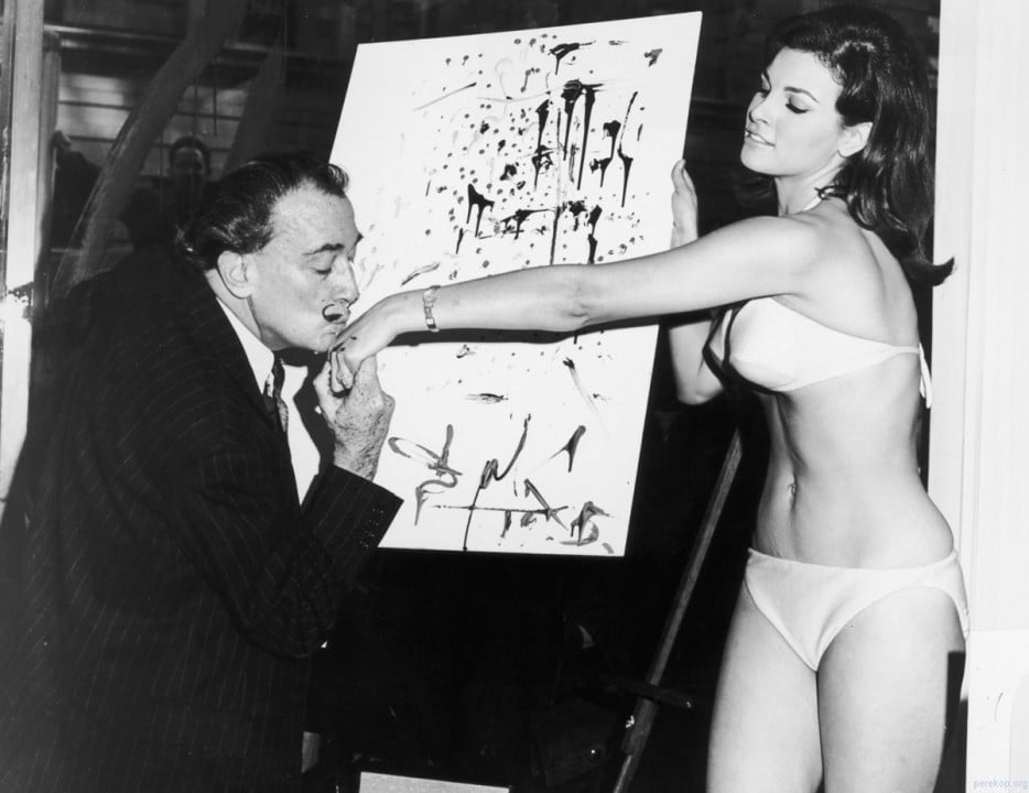 40 – 肖像画を終えた後にラケル・ウェルチの手にキスをするサルバドール・ダリ。 [1965年]