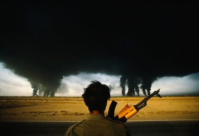 2 – 湾岸戦争中に油田から煙が立ち上げているのを見ているイラン軍。 [1990年]